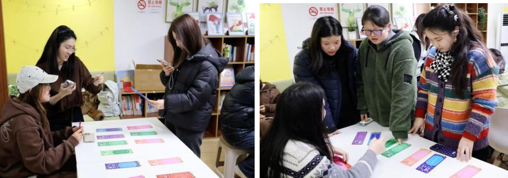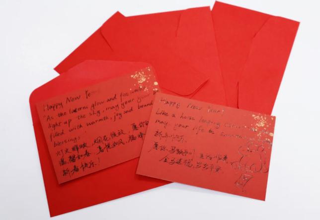 齐猜灯谜,暖意融融。同学们品味联想,集思广益,共同感受灯谜中的意趣。字谜精巧别致,尽显汉字形象之美;成语谜经典隽永,传递深厚文化内涵;事物谜精练传神,彰显汉语的灵动与神韵。成功解谜的同学,都会收获一张学院精心准备的双语手写元宵贺卡。红纸红卡相映,字里行间的祝福与温度,让这份节日喜悦更显绵长。