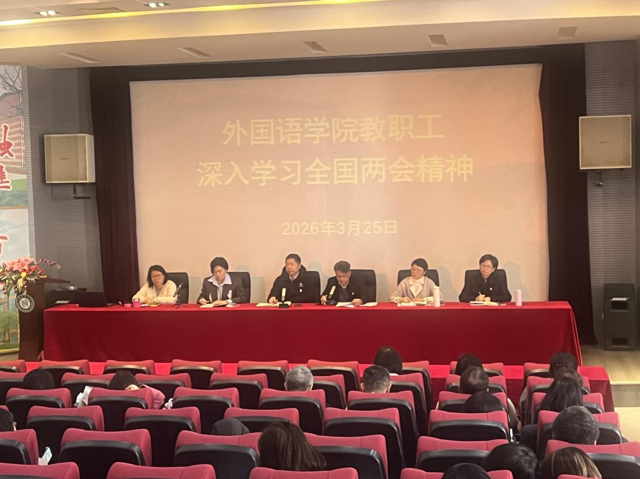 3月25日下午,外国语学院在徐汇校区新大楼110召开全体教职工大会,传达学习全国两会精神。会议由学院党委书记宋波主持,全体教职工参会。