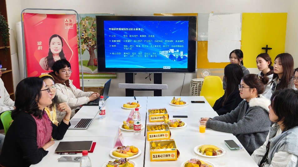 徐蔚回顾了她从教育领域到市场研究行业的转型经历,从英语教师到市场研究专员,从企业合伙人到市场研究领域的自由职业者,每一次华丽转身都深刻阐释了职业发展中“变”与“不变”的辩证关系。她指出,职业规划应兼具务实与开放,同学们可在立足专业、保障发展的基础上,积极探索多元方向。她结合自身跨界创新创业经历,鼓励同学们理性认知自我,明确擅长领域,以开放心态拥抱变化,在时代浪潮中找准自身定位。