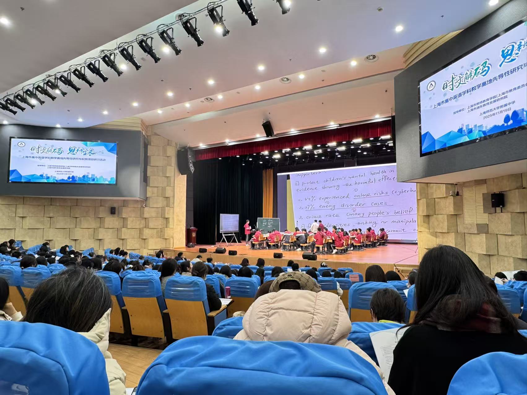 活动伊始,上海师范大学附属中学沈传辰老师带来教学展示课《Evaluating the Potential Benefits and Drawbacks of Social Media Bans for Users Under 16》:以青少年社交媒体限制政策为素材,引导课堂学生开展批判性分析,学生们现场观摩了这一思辨互动的完整设计与实施过程,直观感受了时文阅读在课堂中的应用方式。
