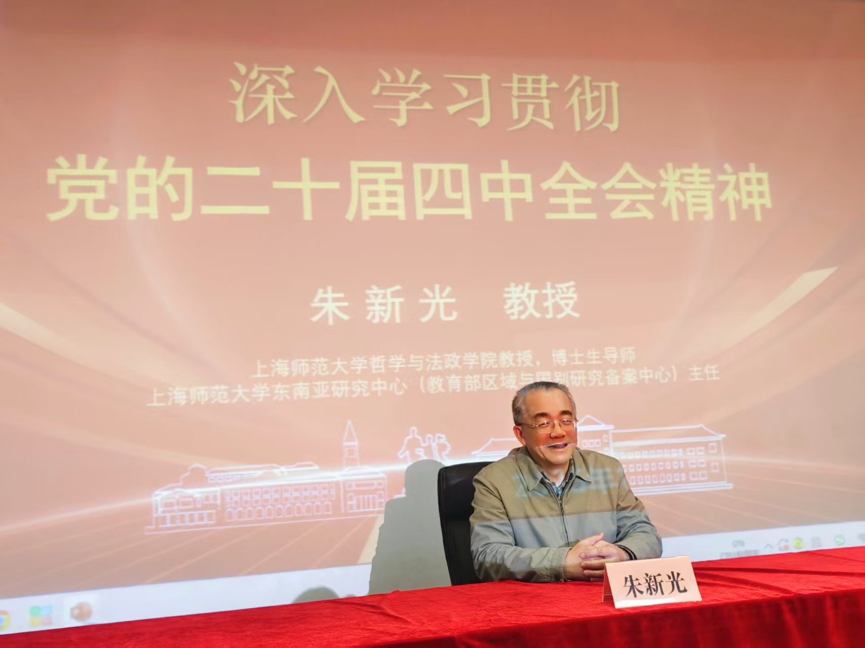 为深入学习贯彻党的二十届四中全会精神和习近平总书记重要讲话精神,引导两院教职工准确把握全会的重大战略意义、核心要义与决策部署,深刻理解教育强国在现代化建设全局中的基础性地位,12月10日下午,外国语学院与对外汉语学院在新大楼110联合举办教职工理论学习专题辅导报告。会议特邀上海师范大学哲学与法政学院教授、博士生导师,上海师范大学东南亚研究中心主任朱新光教授作专题辅导。两院全体教职工参加学习。