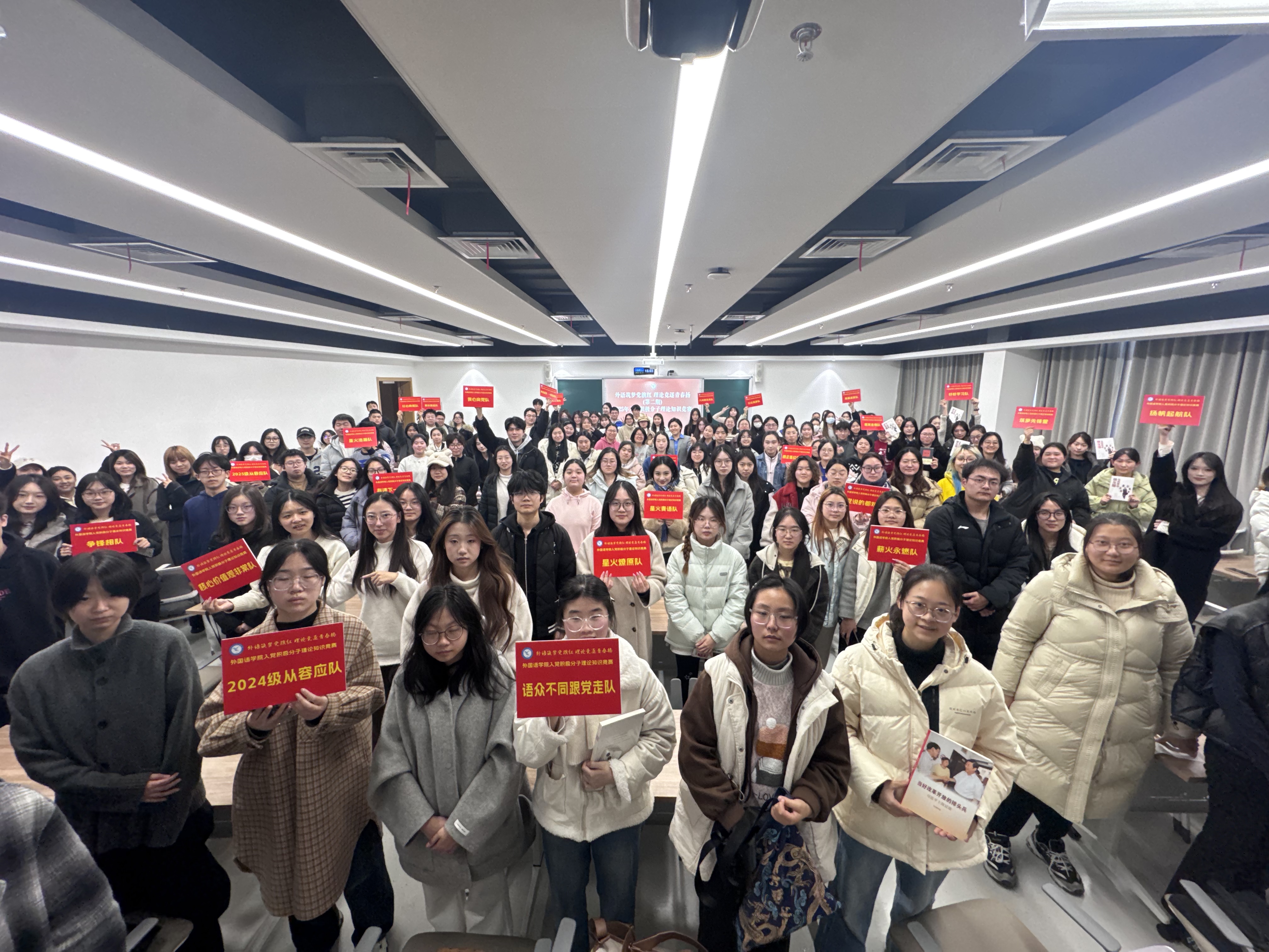 为深入学习贯彻党的创新理论,加强入党积极分子常态化教育,提升政治素养和理论水平,12月17日下午14:00,外国语学院于奉贤校区新大活B座401举办“外语筑梦党旗红,理论竞逐青春扬”(第二期)入党积极分子理论知识竞赛。学院党委副书记(主持工作)程雪,党委副书记、副院长臧艳雯,党委组织员范蓓,世承党支部书记、2023级本科生辅导员郭浩澜出席活动。世承党支部党员徐沁怡担任主持,158名入党积极分子踊跃参加竞赛,一同开启本次以理论滋养初心、以竞逐砥砺青春的知识旅程。